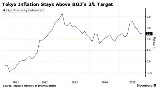 剔除能源与生鲜食品的“超核心”通胀指标(反映潜在物价压力)同比上涨2.5%,同样低于经济学家2.9%的预期;整体通胀率也录得2.5%。由于东京CPI通常被视为日本全国通胀走势的先行指标,因此备受经济学家关注。